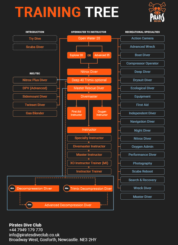 | Open Water 20 – £445 Available from 15 years old, this certification introduces the theory enabling you to practice and master essential underwater skills in the pool before moving on to four dives in open water, allowing you to dive with a certified dive buddy to 20 metres. Combine with drysuit training for £550. For 12 to 15-year-olds, the Junior Open Water Diver course is a fantastic opportunity to build confidence and gain new skills while exploring the underwater world. It encourages teamwork and responsibility, hopefully sparking a lifelong love for marine conservation. It’s the ultimate way for kids to connect with nature, make unforgettable memories, and experience the thrill of diving alongside friends! The Junior Open Water certification entitles the holder to dive with a certified adult dive buddy of equal or higher certification to a maximum depth of 18m. The Cadet Open Water course is an exciting introduction to scuba diving for 10 and 11-year-olds, allowing them to safely explore the underwater world while limited to a maximum depth of 12m. This course is perfect for young adventurers, helping them build confidence, learn essential diving skills, and foster a love for marine life in a fun and safe environment. It’s an incredible opportunity for kids to create lasting memories and share thrilling underwater experiences with friends and family! The Cadet Open Water certification entitles the holder to dive with a certified adult dive buddy of equal or better certification to a maximum depth of 12m. Minimum of 4 confined water dives and 4 open water dives. |